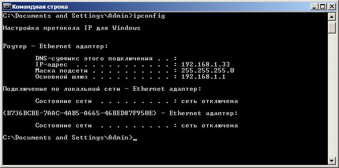 Рис. 1.10. Утилита ipconfig, показывающая IP-адрес компьютера